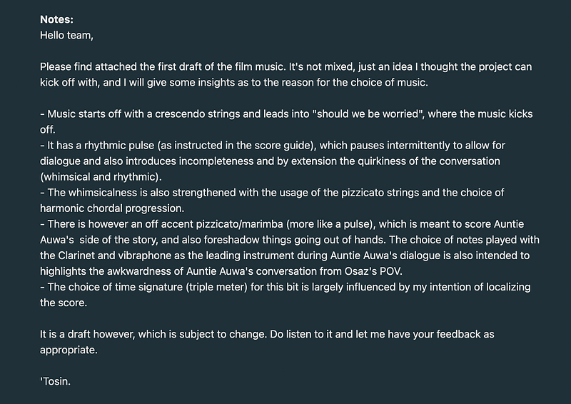 In May, we signed up a film producer Tosin to start the score again from scratch using the sound design document we created and the existing explorations from Osarumen and Remy as a guide.