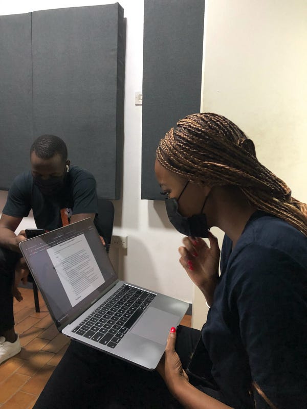 As described, Oshuwa read the lines while Kolade stitched them together. Daniel and Chuks made suggestions and I was mostly in charge of the AC (we had to turn it off when recording to avoid noise).